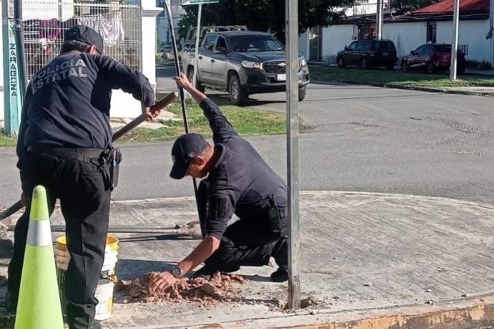 En la colonia Centro de Chetumal, los elementos instalaron se帽ales restrictivas de alto y retiraron ramas de 谩rboles que obstru铆an la correcta visualizaci贸n de los mismos.