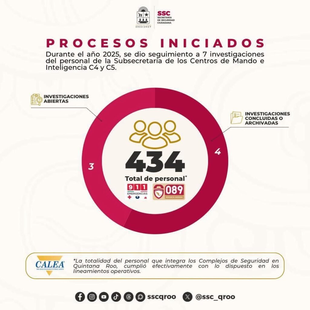 Con base en el reglamento Interior de la Secretaría de Seguridad Ciudadana y en apego a lo dispuesto por la directiva 1.4.11 de la Comisión para la Acreditación de Agencias de Aplicación de la Ley (CALEA), y conforme a los lineamientos establecidos para garantizar el cumplimiento de estándares internacionales en materia de seguridad pública; se informa que durante el 2025, de un universo de 434 trabajadores que integran las diversas áreas de los Centros de Mando e Inteligencia en el Estado, unicamente se registraron siete investigaciones al personal; las cuales tuvieron el seguimiento oportuno ante Consejo de Honor y Justicia Policial, y ante la Unidad de Asuntos Internos.