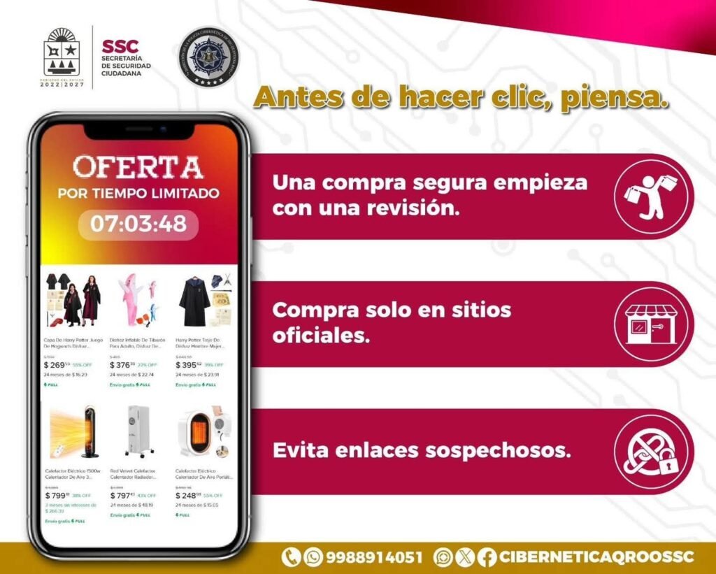 Este Buen Fin, evita fraudes y compra solo en sitios seguros. Reporta de inmediato a la Dirección de la Policía Cibernética de Quintana Roo por WhatsApp al 998 891 40 51.
